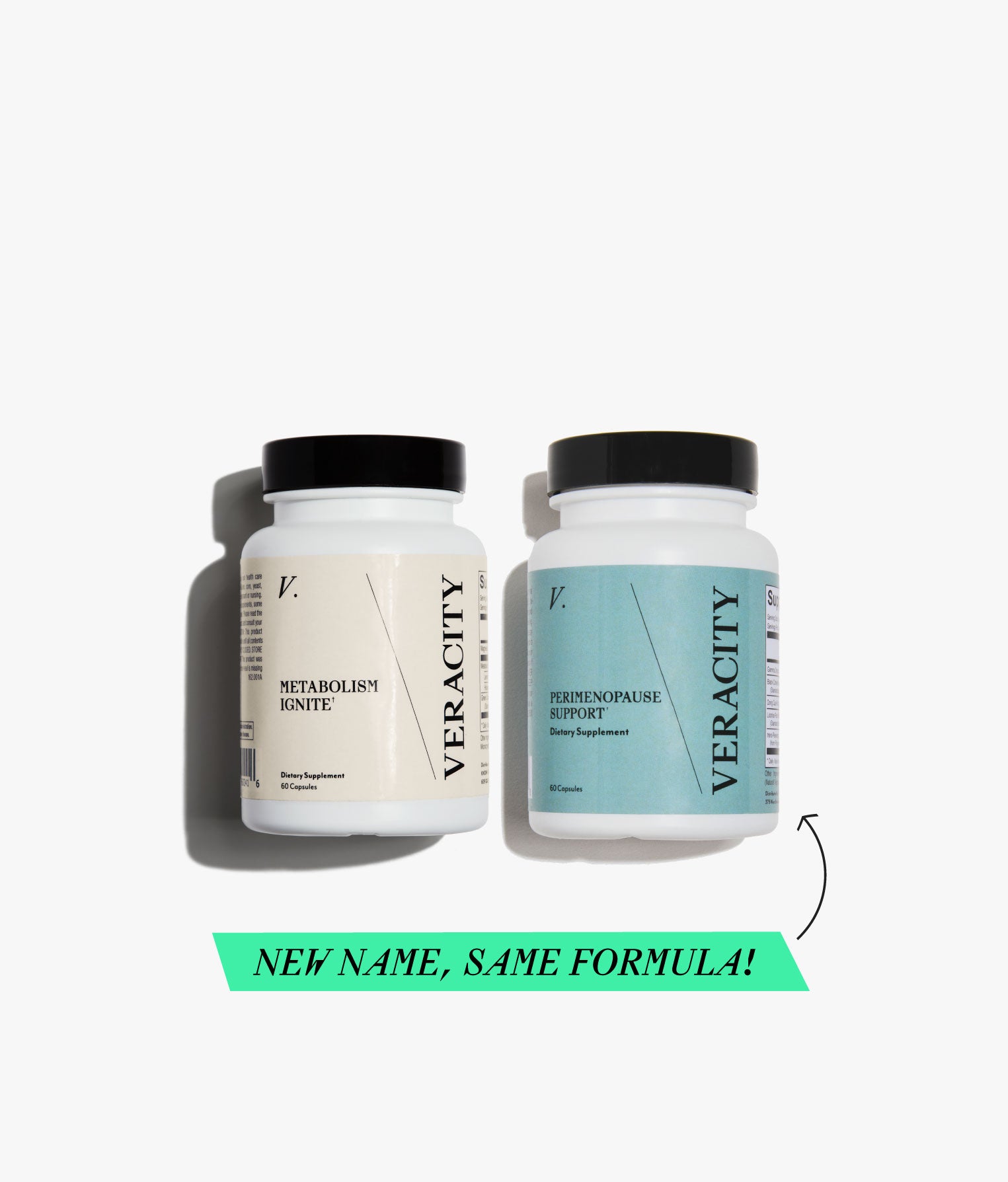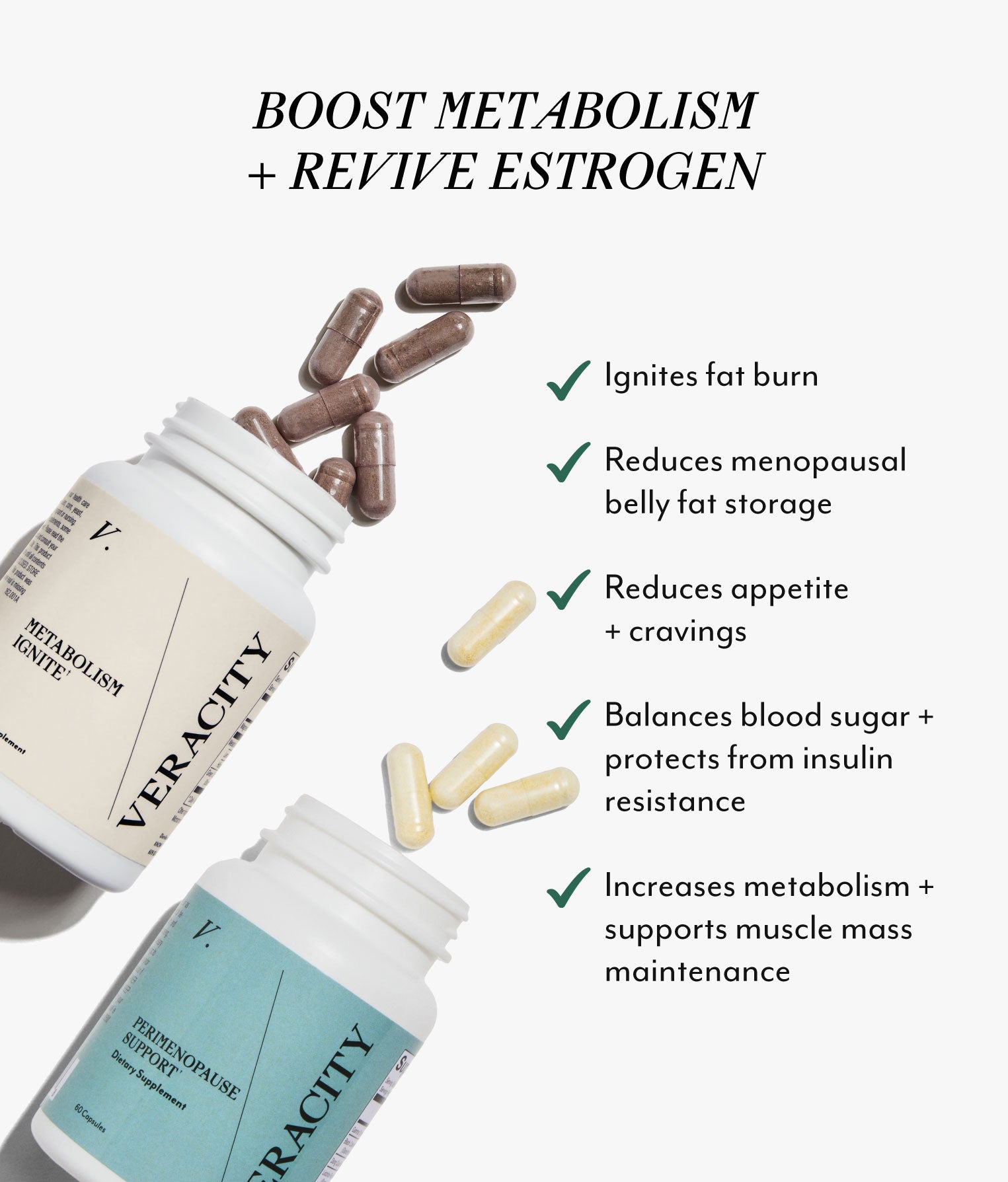 Metabolism Ignite helps activate your body's natural weight loss mechanisms, and estrogen has a direct impact on metabolism and the body’s ability to lose weight. Lower levels, from perimenopause, can lead to loss of muscle mass and reduced energy expenditure, decreased insulin sensitivity, and fat storage around the belly. Harnessing the power of clinically proven natural botanicals, Perimenopause Support and Metabolism Ignite work together by regulating estrogen levels and switching on energy burn to supercharge weight loss.